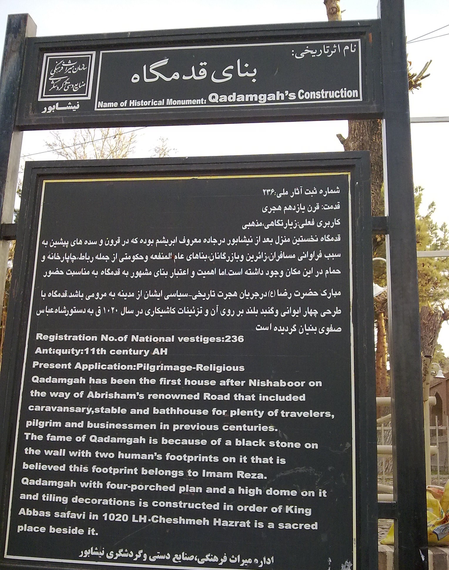 قدمگاہ تاریخی اعتبار سے بھی نہایت اہمیت کا حامل ہے، لہذا آپ سے گزارش ہے کہ جب امام رضا علیہ السلام کی زیارت کا شرف حاصل کریں تو قدمگاہ کی زیارت سے بھی فیض یاب ہونے کی کوشش کیجئے۔